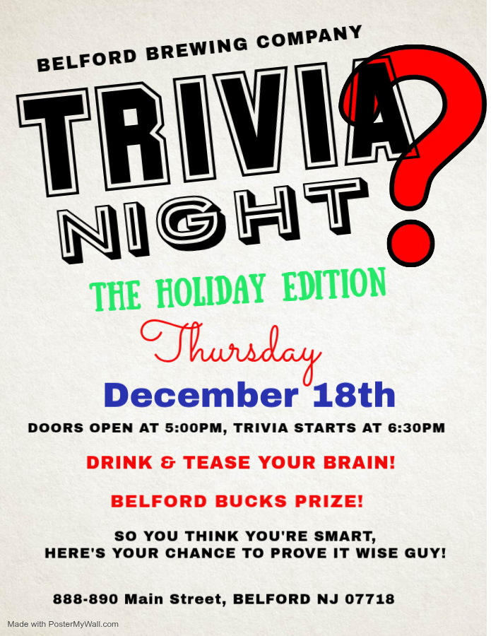 Belford Brewing Trivia Night – The “Holiday” Edition – Thursday December 18th, 2025 – 6:30PM
