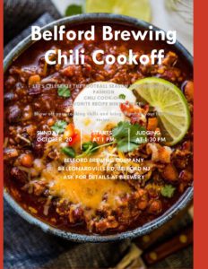 1:00 pm: Belford Brewing Chili Competition - October 20th, 2024 - 1PM1:00 pm: Belford Brewing Chili Competition - October 20th, 2024 - 1PM – Come out Sunday October 20th at 1:00 PM for "Belford Brewing Chili Throwdown". For those who believe they make the best chili, here is your chance to prove it. Bring in a crock pot of your favorite chili recipe and our judges will decide who has the best chili in the house. Prizes will be given to the winners. It a great chance to try all different types of wings, with a beer and watch some Football all at once. It will be a fun time for all. Cheers!