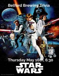 6:30 pm: Belford Brewing Trivia Night - Thursday May 2nd, The "Star Wars" Edition6:30 pm: Belford Brewing Trivia Night - Thursday May 2nd, The "Star Wars" Edition – Come out Thursday May 16th at 6:30 PM for "Belford Brewing Trivia Night". The theme for the night is "Star Wars" nothing but Star Wars! The greatest movies series of all-time. Test your knowledge on how much you remember over the past 50 years! If you bring in something Star Wars related or wear something Star Wars related you will receive an additional 20 points. Should be fun! Maybe you could win some Belford Bucks! Belford Brewing Company |