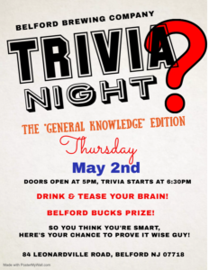 6:30 pm: Belford Brewing Trivia Night - Thursday May 2nd, General Knowledge6:30 pm: Belford Brewing Trivia Night - Thursday May 2nd, General Knowledge – Come out Thursday May 2nd at 6:30 PM for "Belford Brewing Trivia Night". The theme for the night is "General Knowledge". We will be going back to our original format of multiple choice, fill in your answer and a secret top ten final round. Should be fun! Maybe you could win some Belford Bucks! Belford Brewing Company |